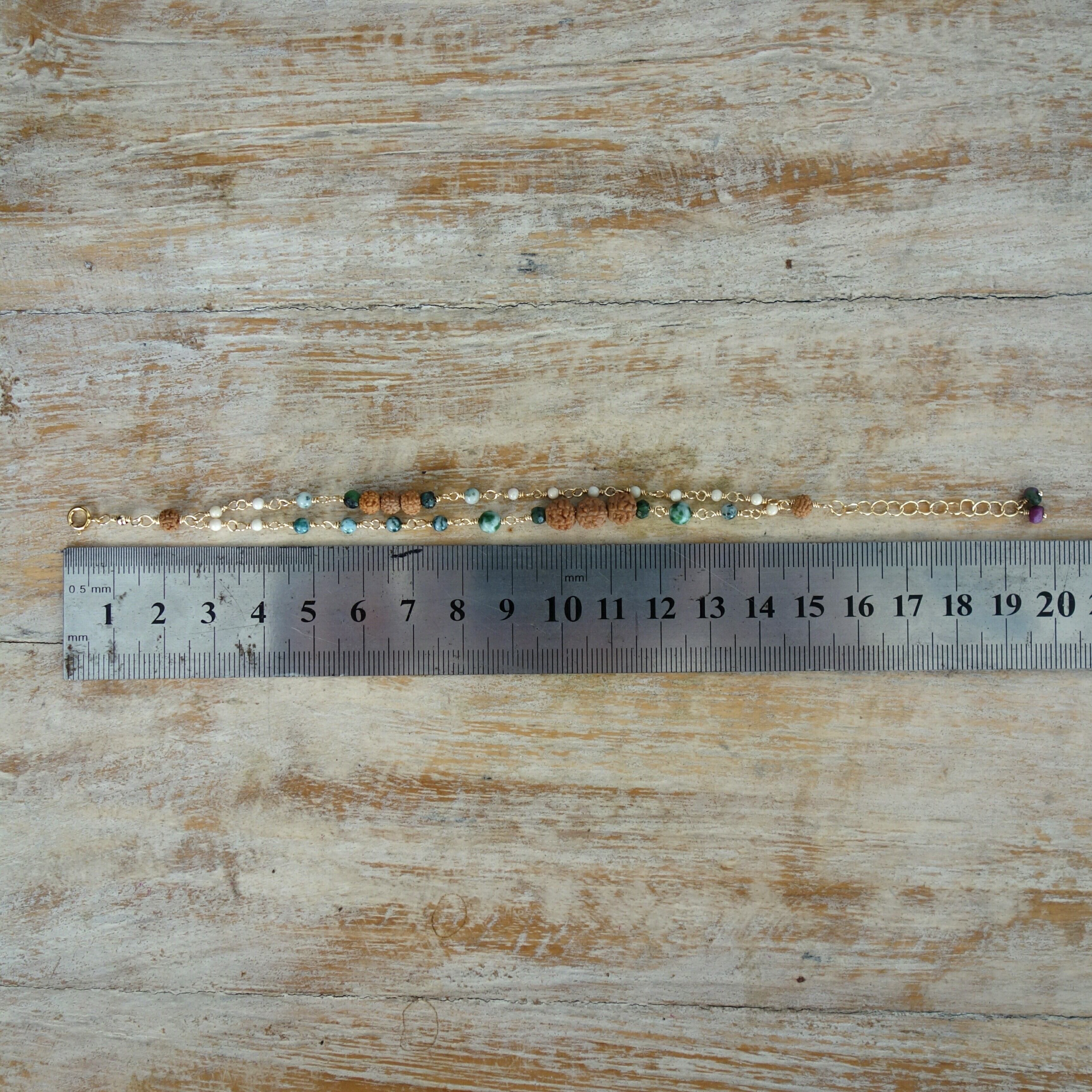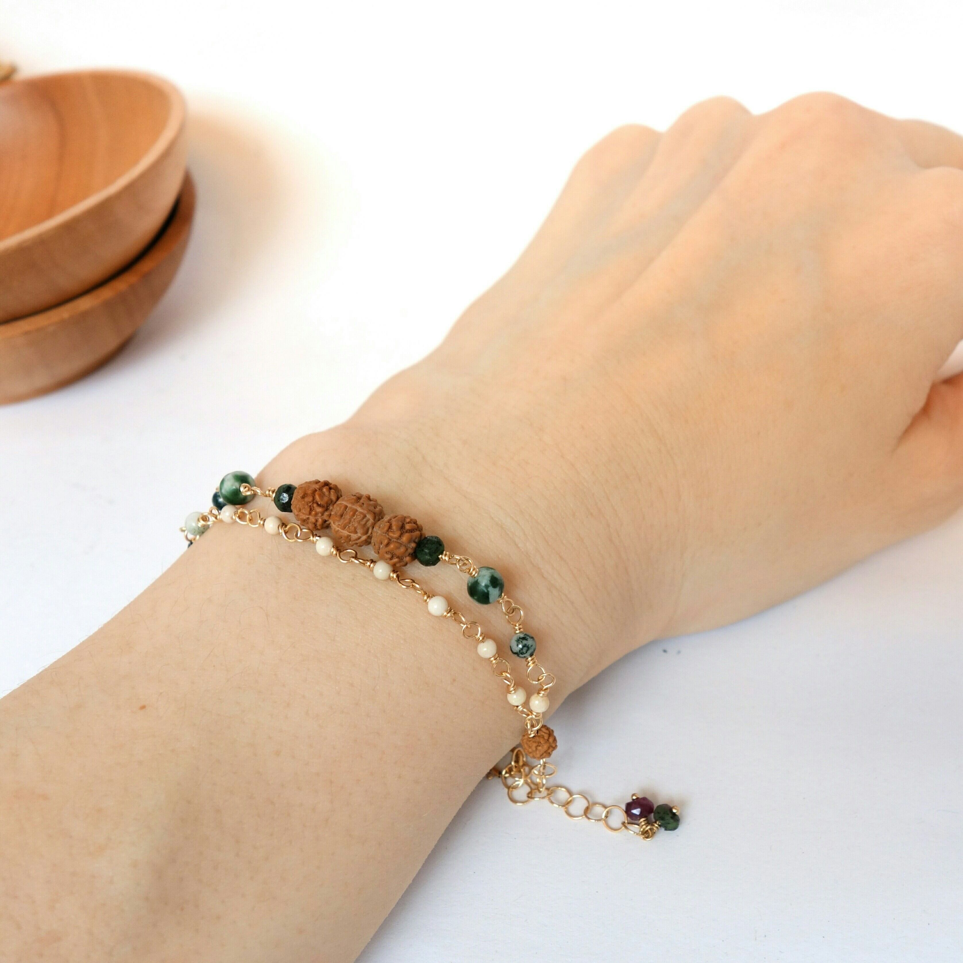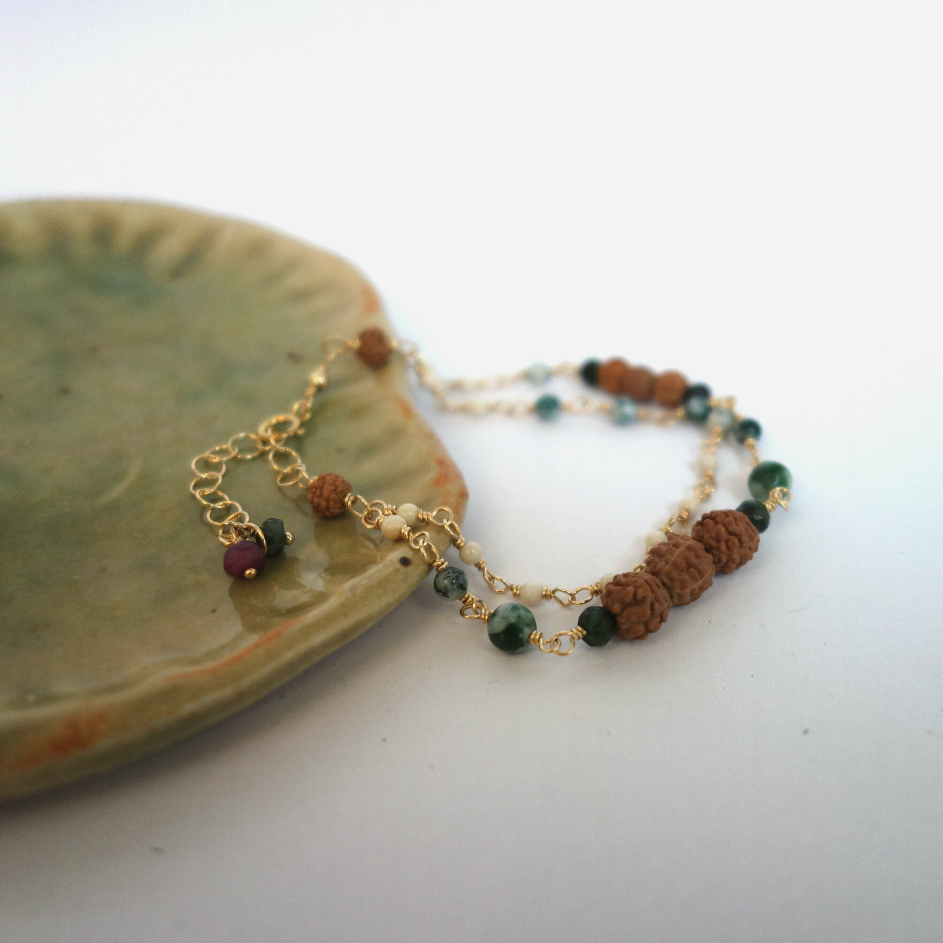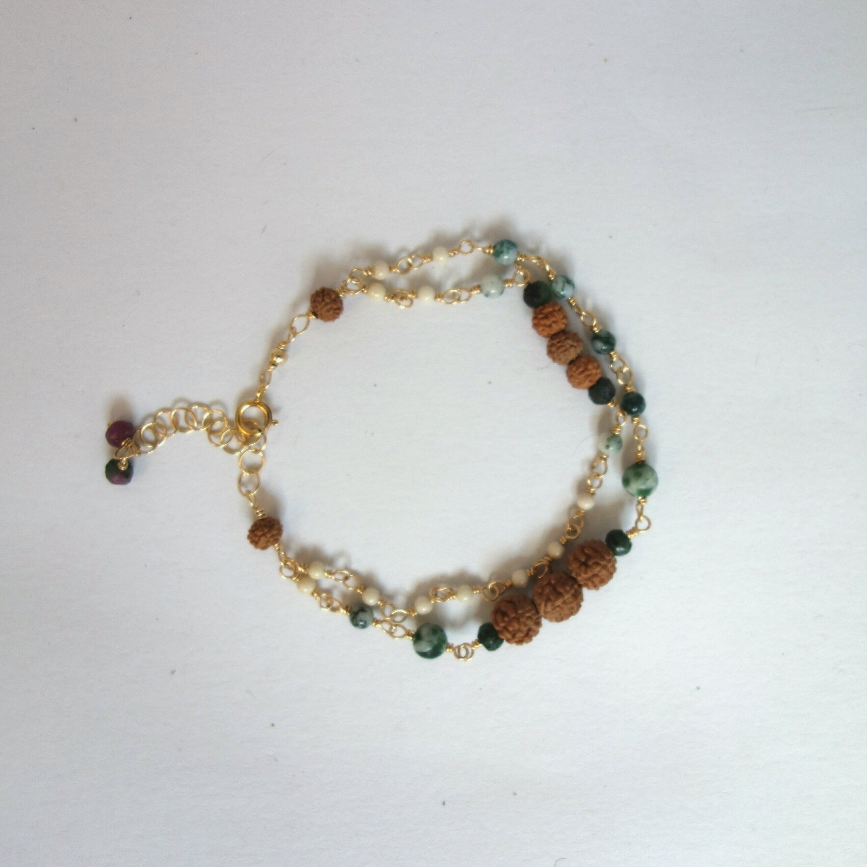 強い浄化作用を持つルドラクシャを使用した2連ブレスレットです。ルドラクシャのサイドには深い緑のルビーインゾイサイトを沿え、その他ツリーアゲート、リバーストーンといった落ち着いた色合いの天然石を使用し、飽きのこないデザインとなっております。