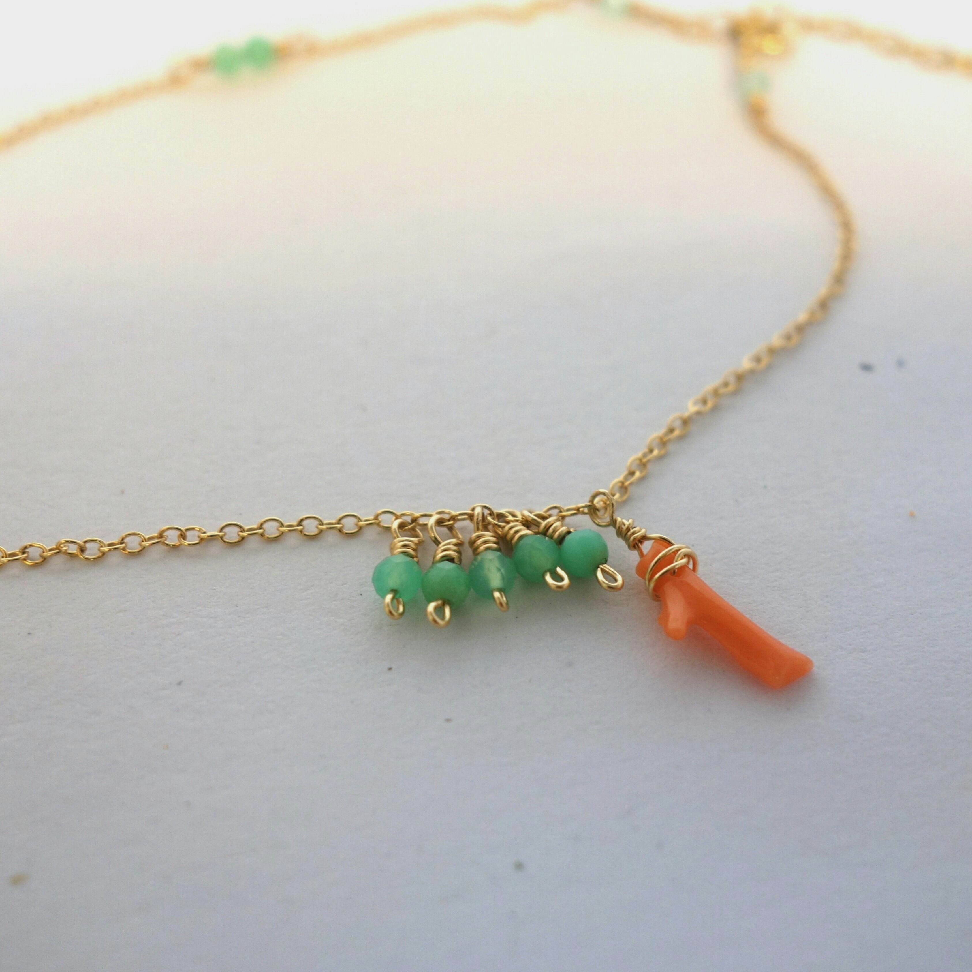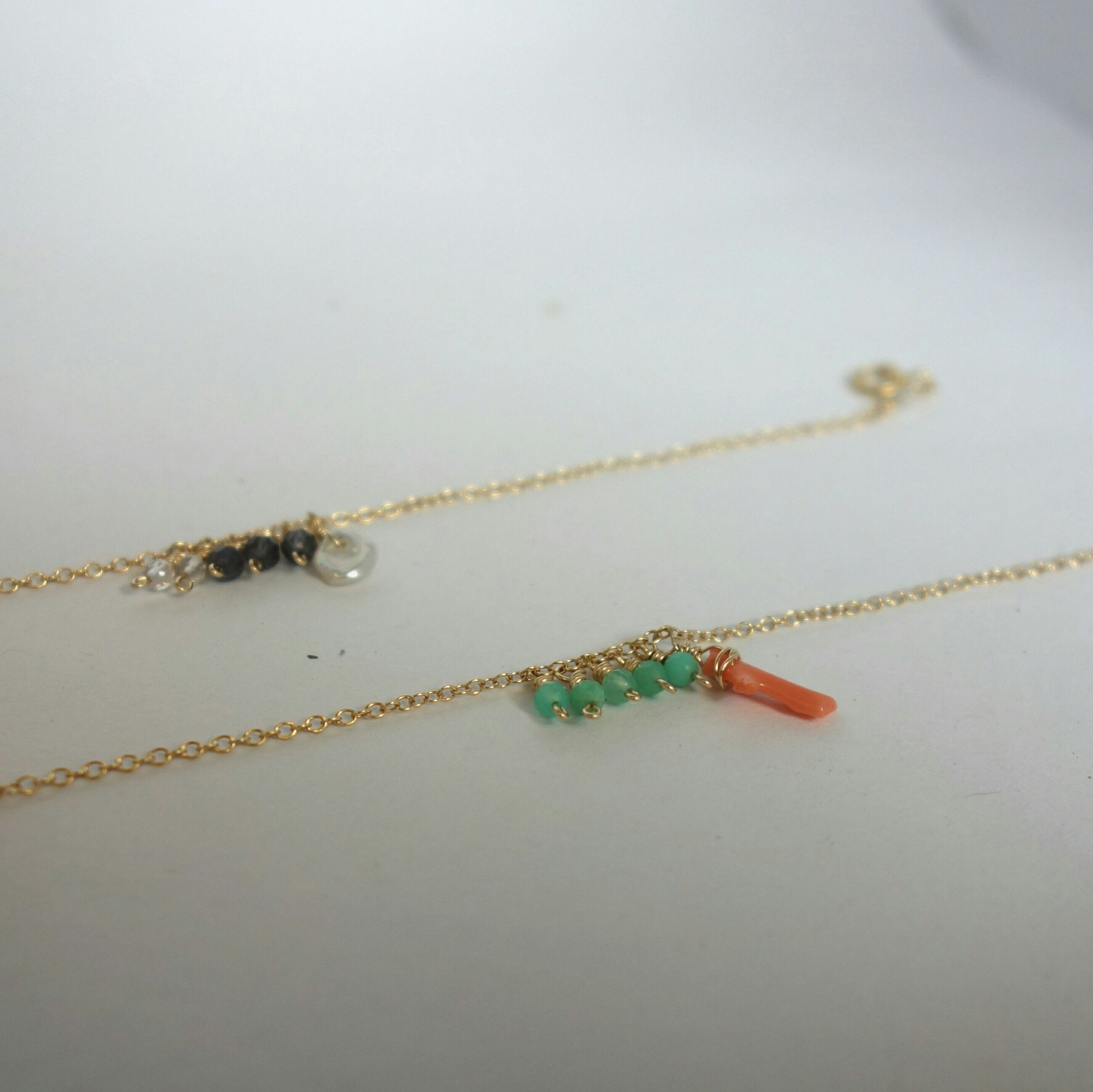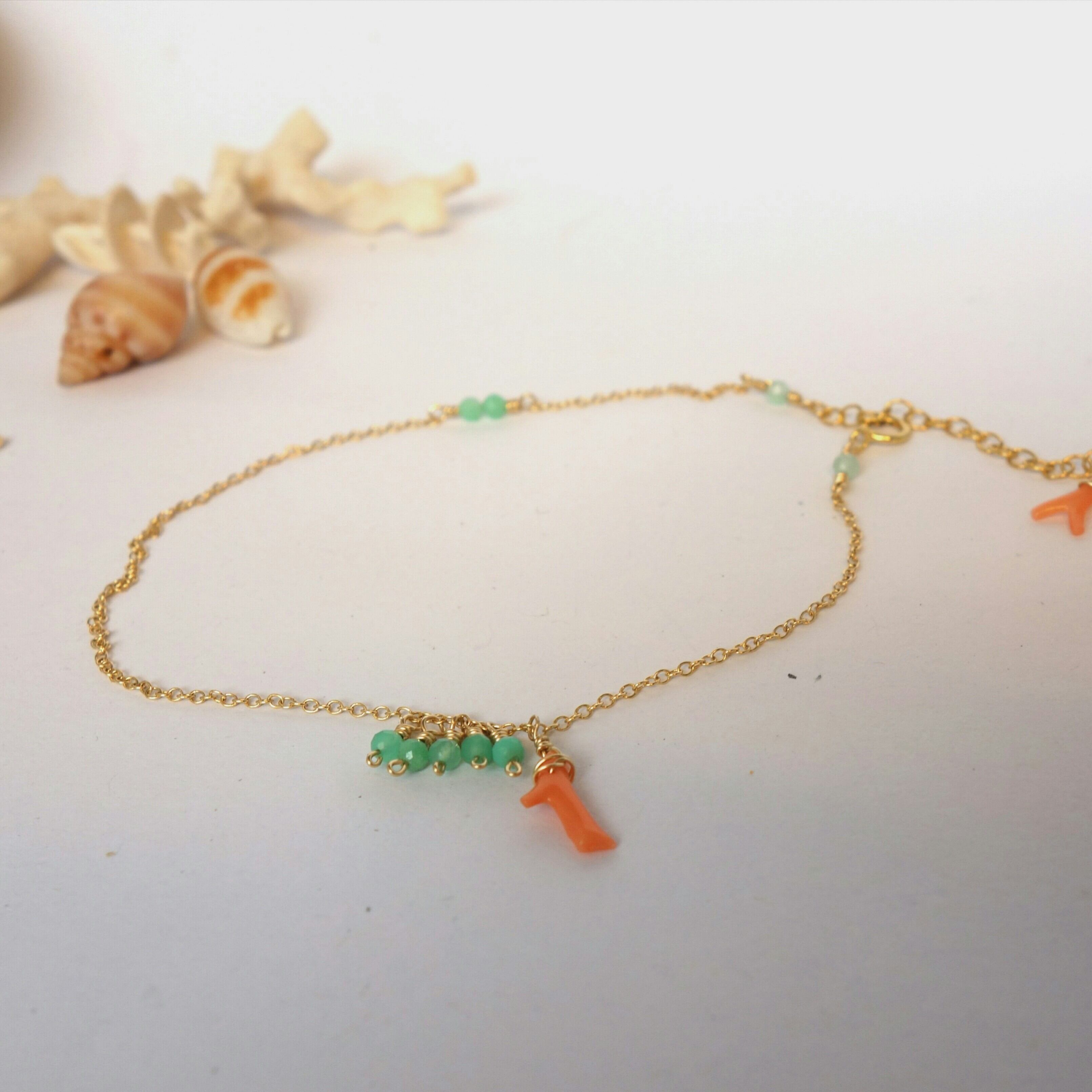 爽やかな色合いのクリソプレーズと、天然色のピンクコーラルが明るい気持ちにさせてくれるシンプルなアンクレットです。