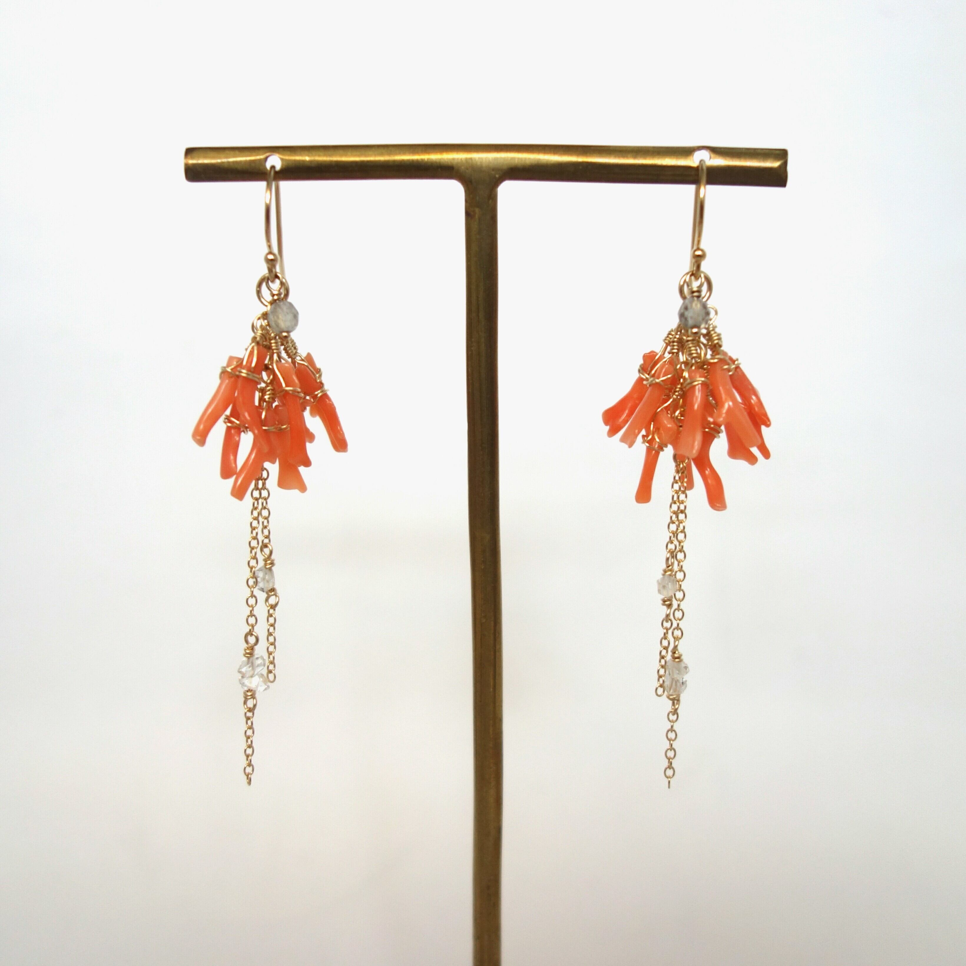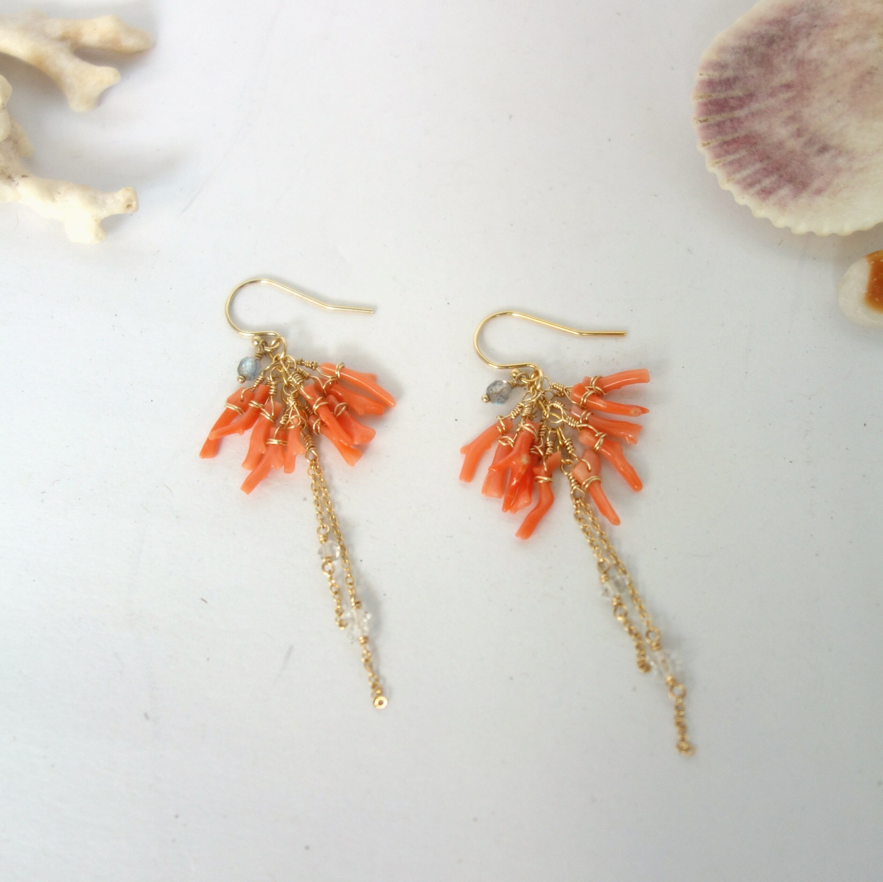 【再販可能】ピンクコーラルとハーキマーダイヤモンドのふさふさピアス【14kgf/天然石】