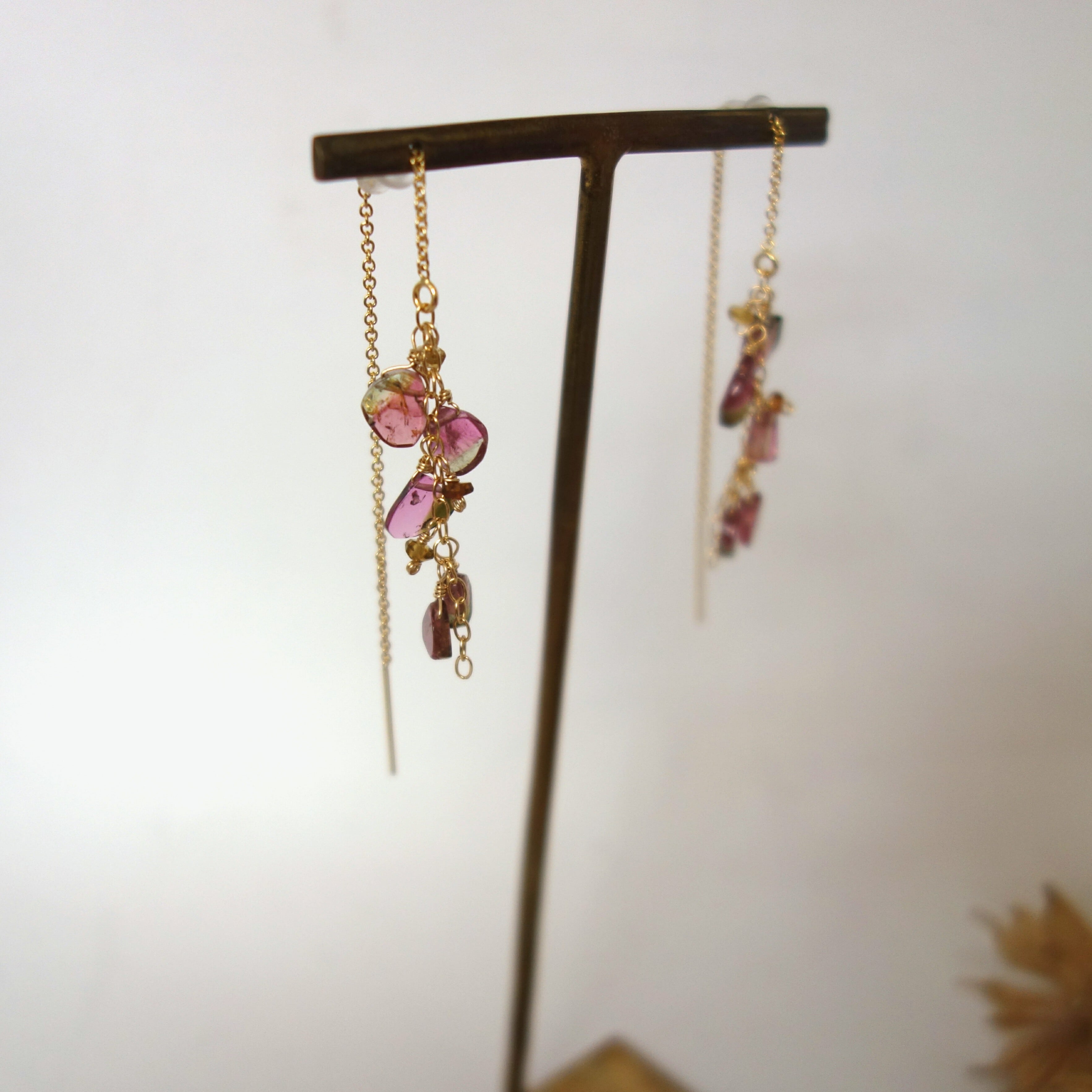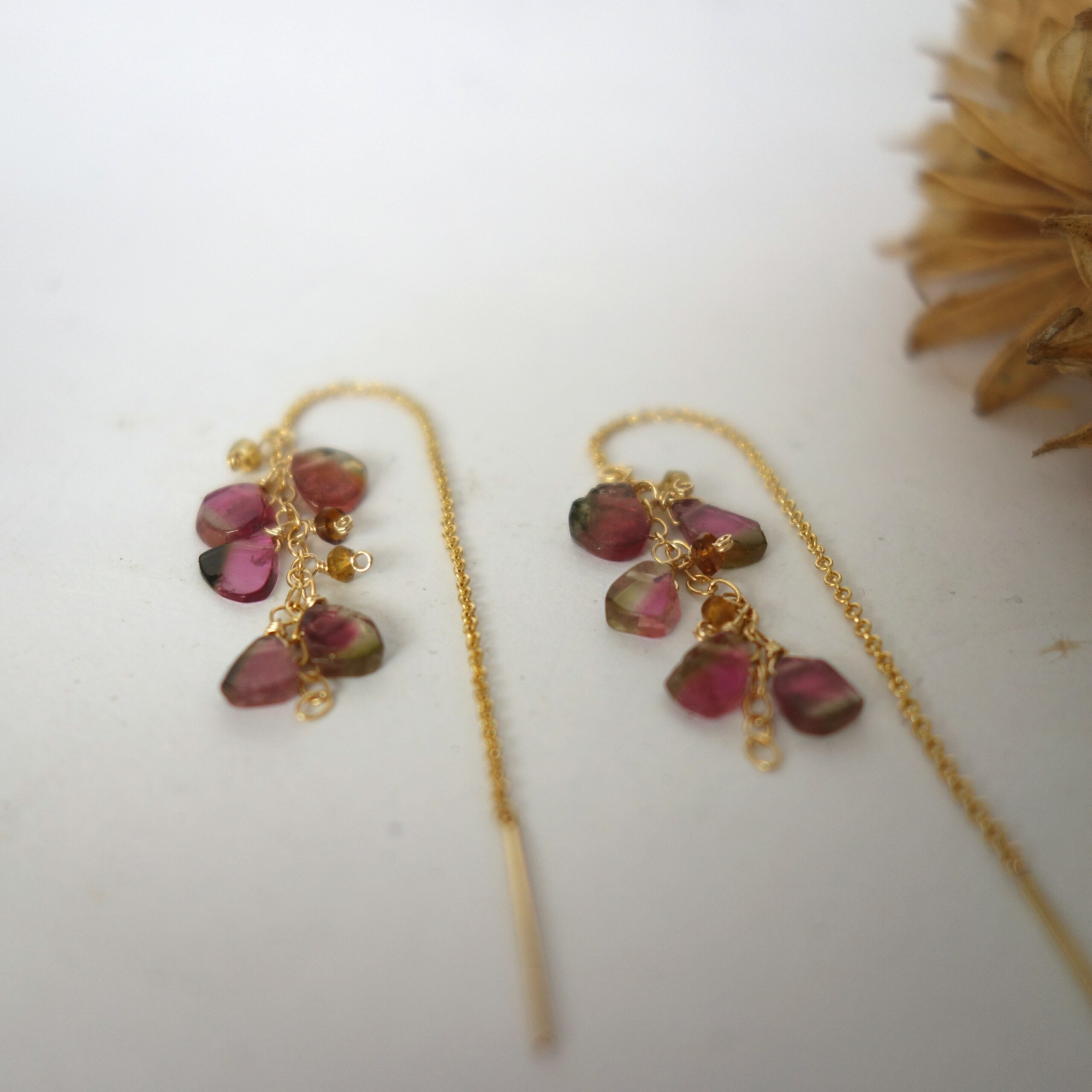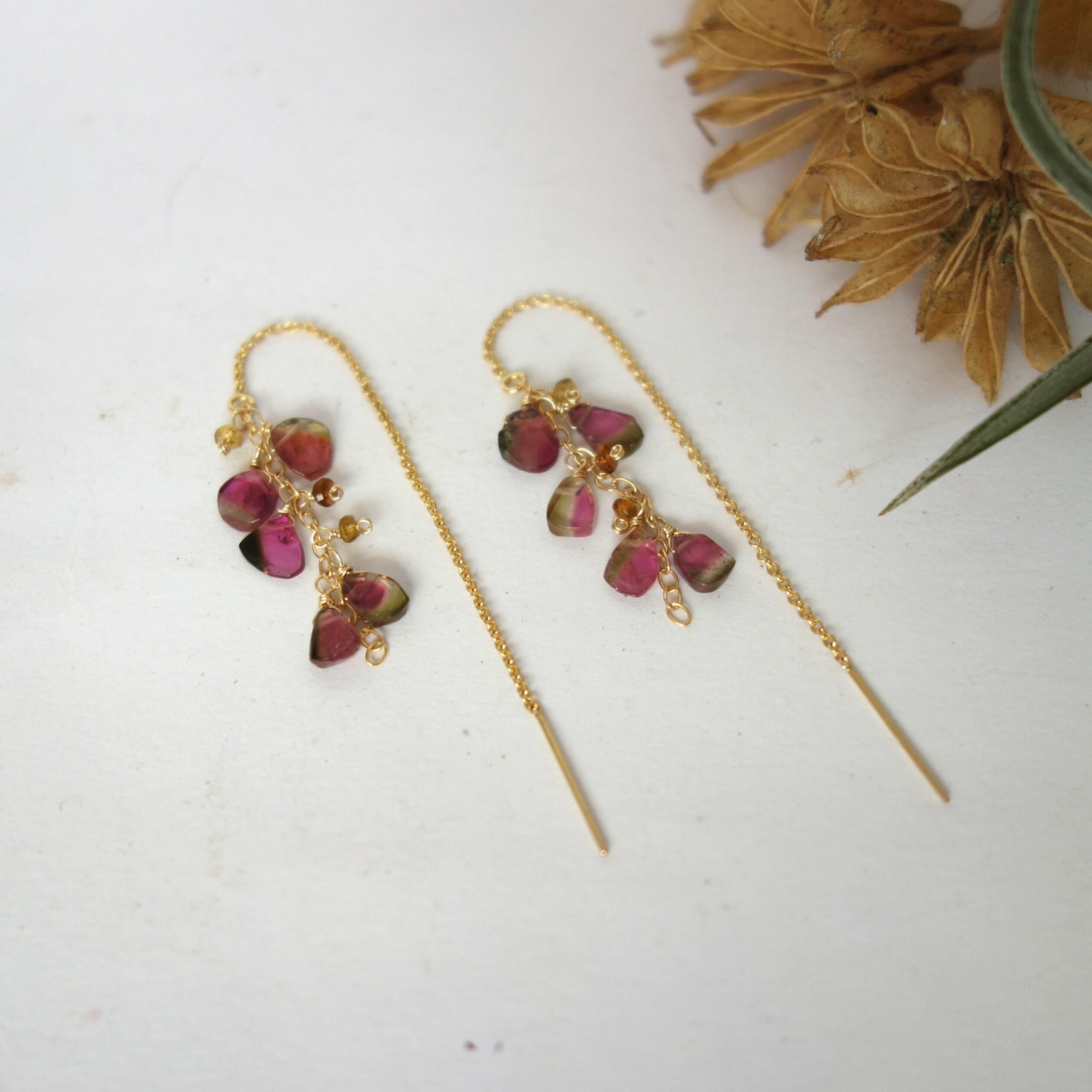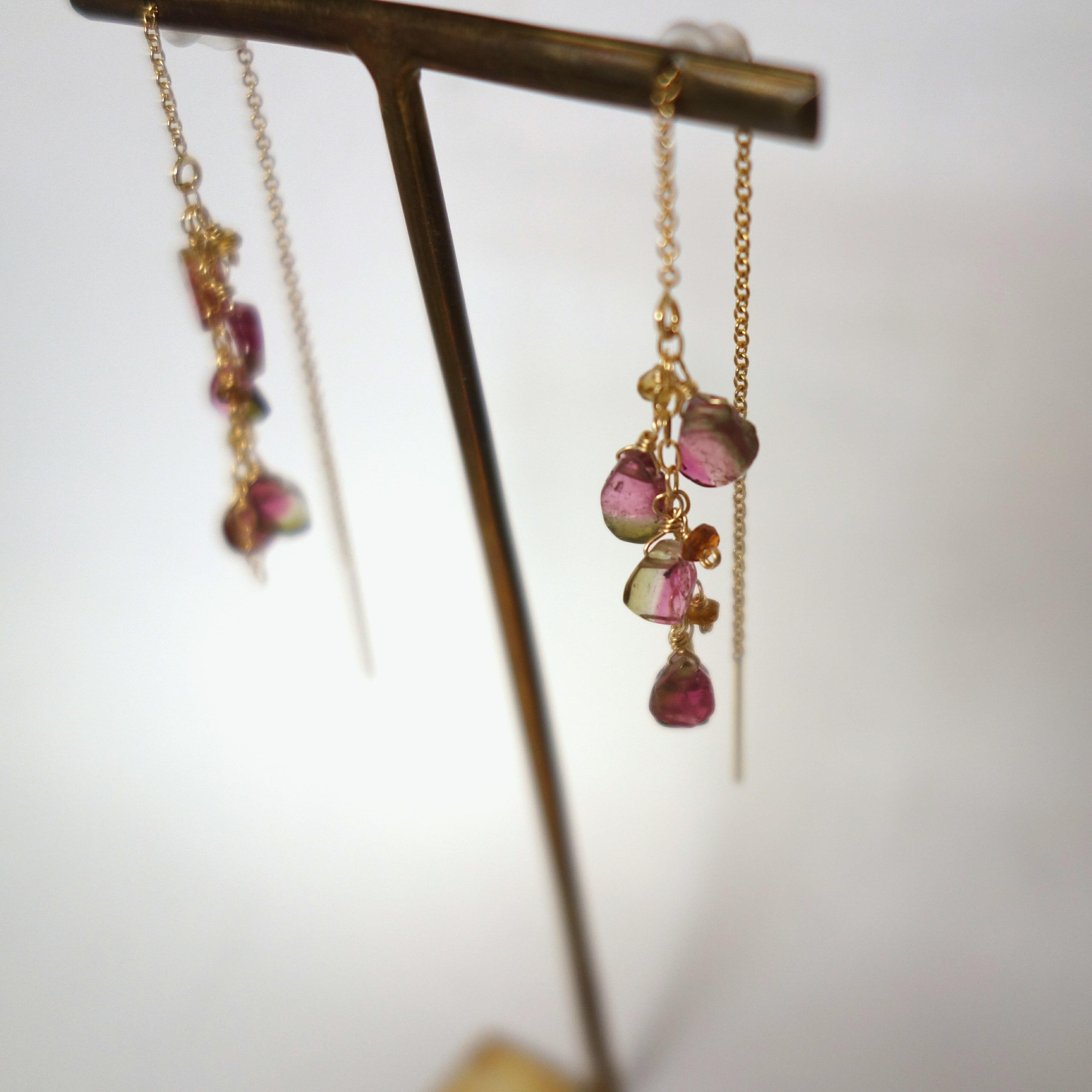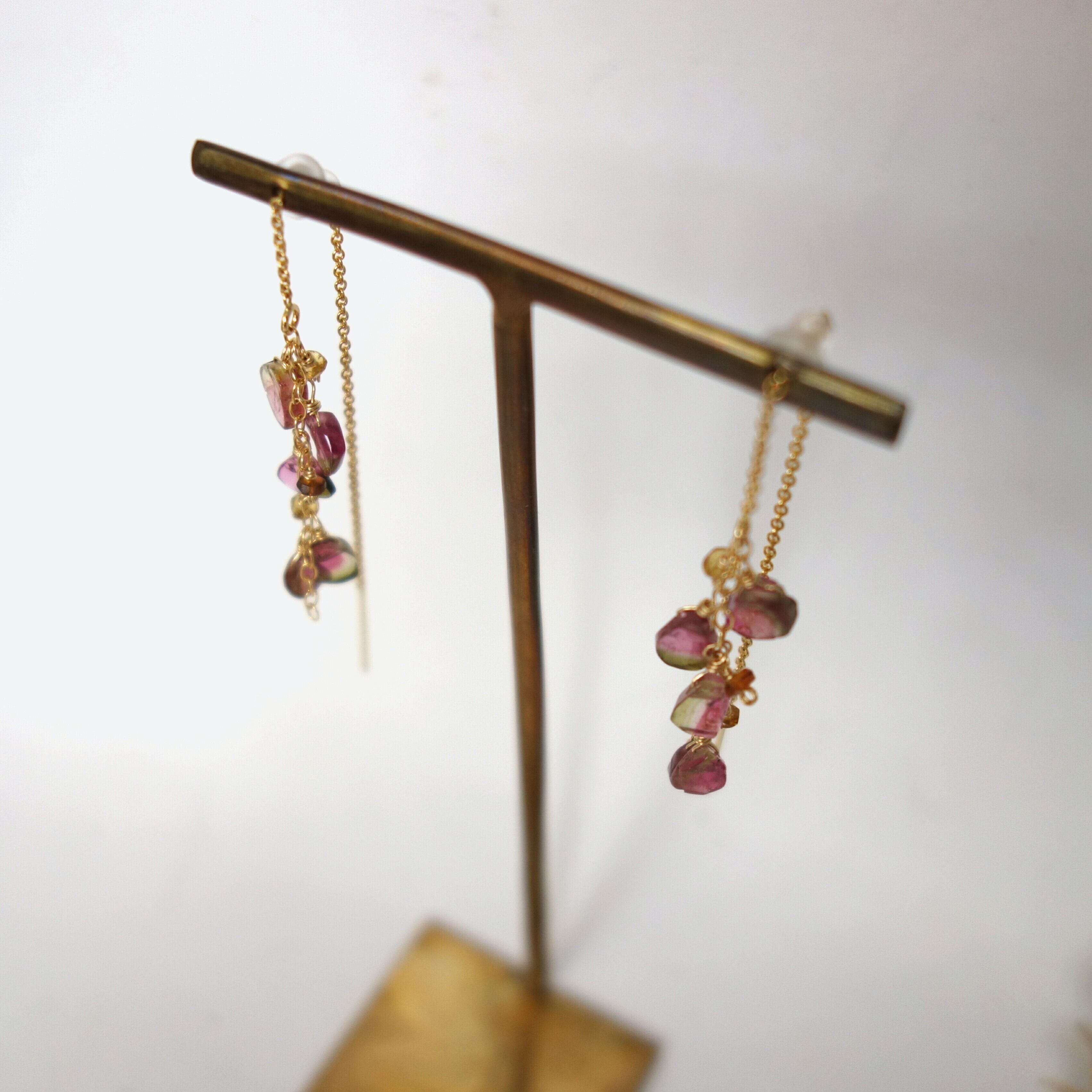 その中でも1粒の中に緑とピンクが混在してまるでスイカのような色合いを持ち合わせている貴重なウォーターメロントルマリンを、ふんだんに使ったアメリカンピアスです。