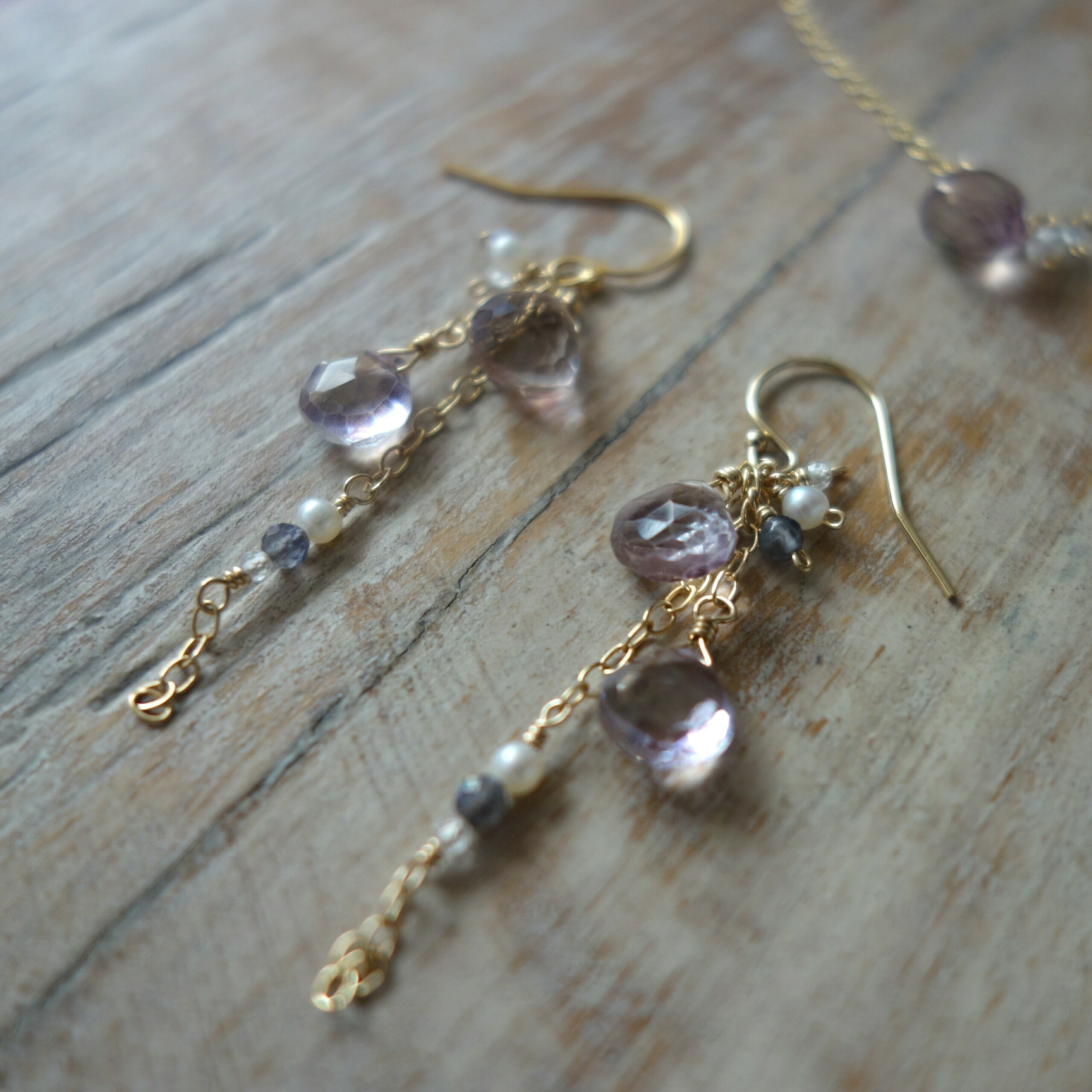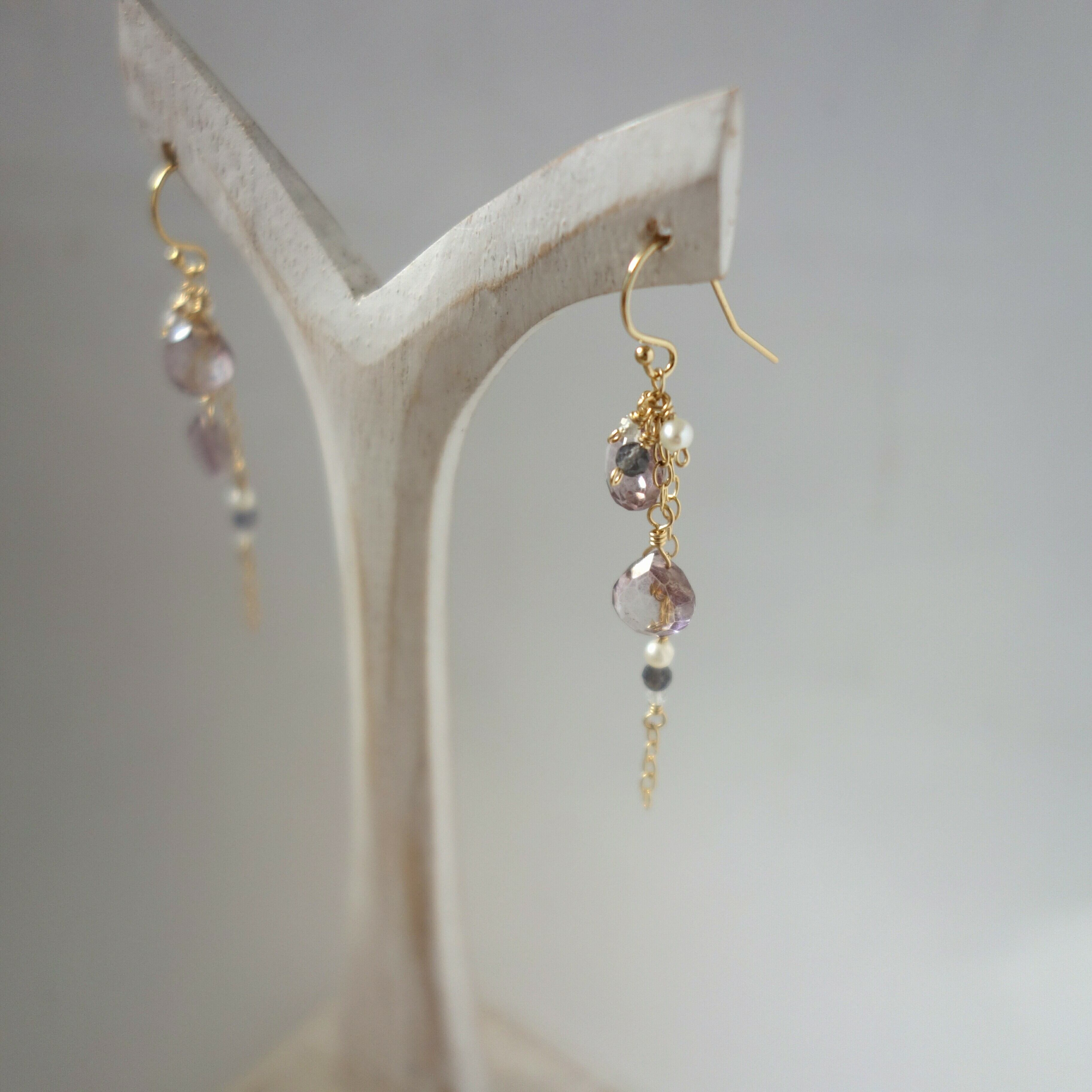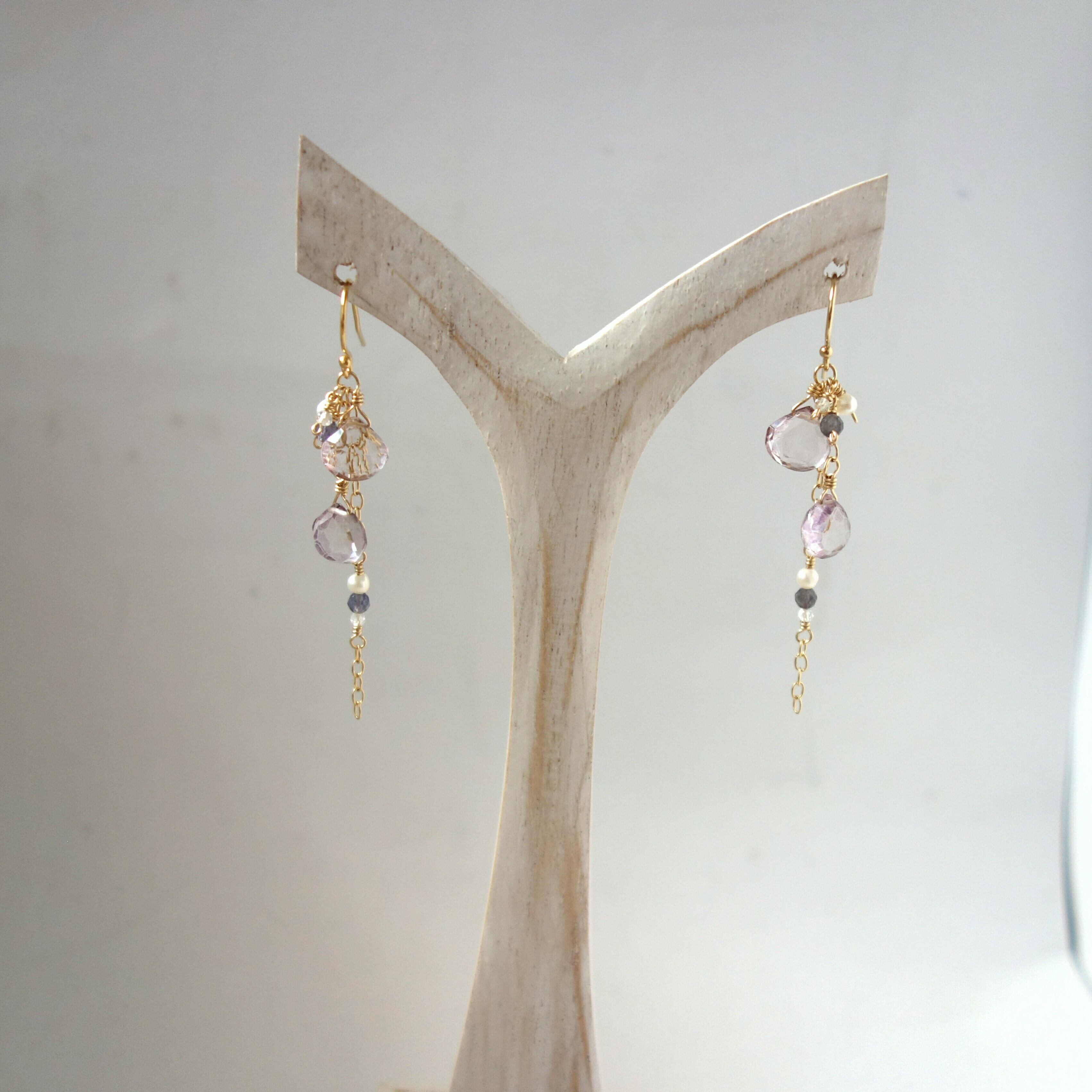 淡い色合いのピンクアメジストに、アイオライト、淡水パール、ホワイトトパーズをあわせた春らしい色合いのピアスです。