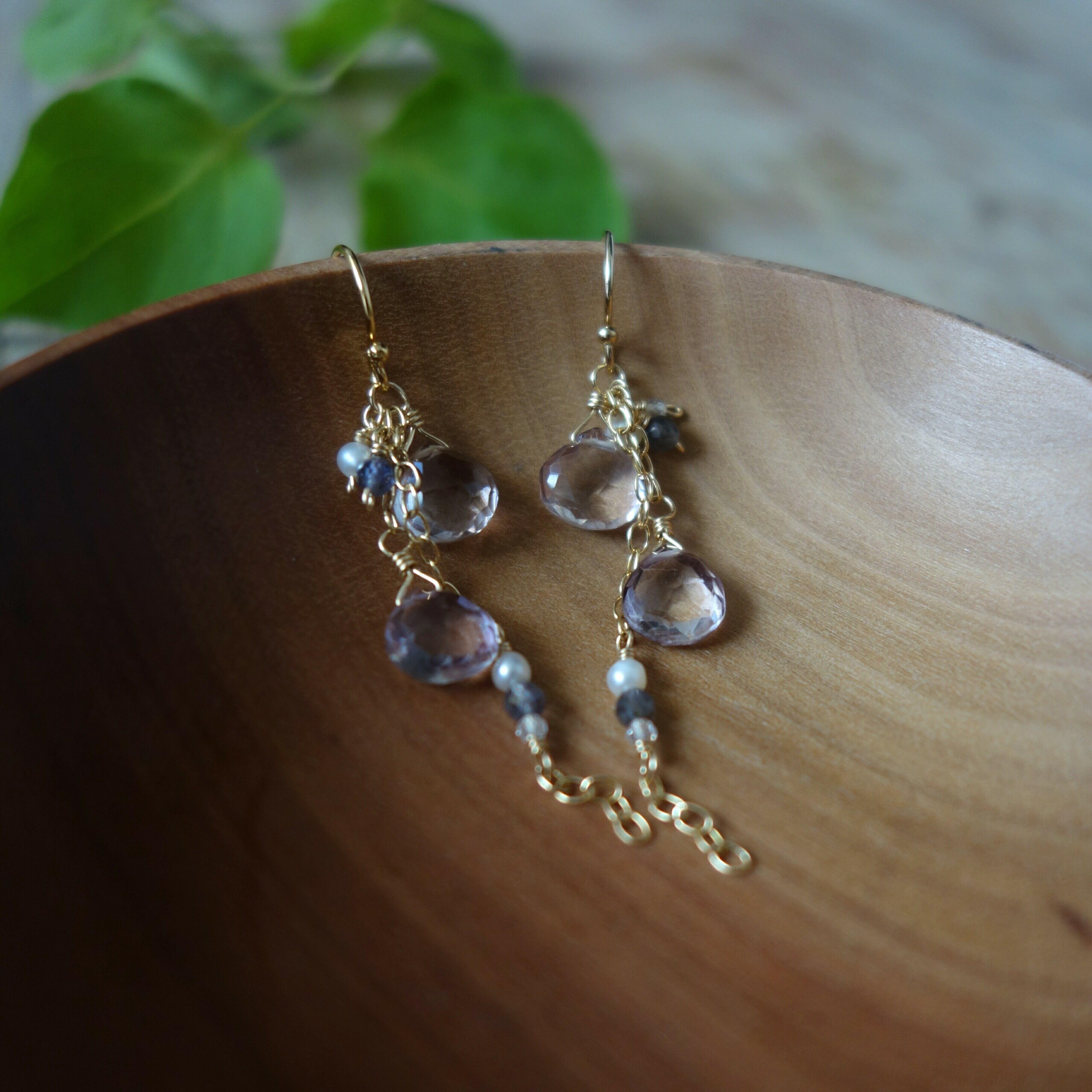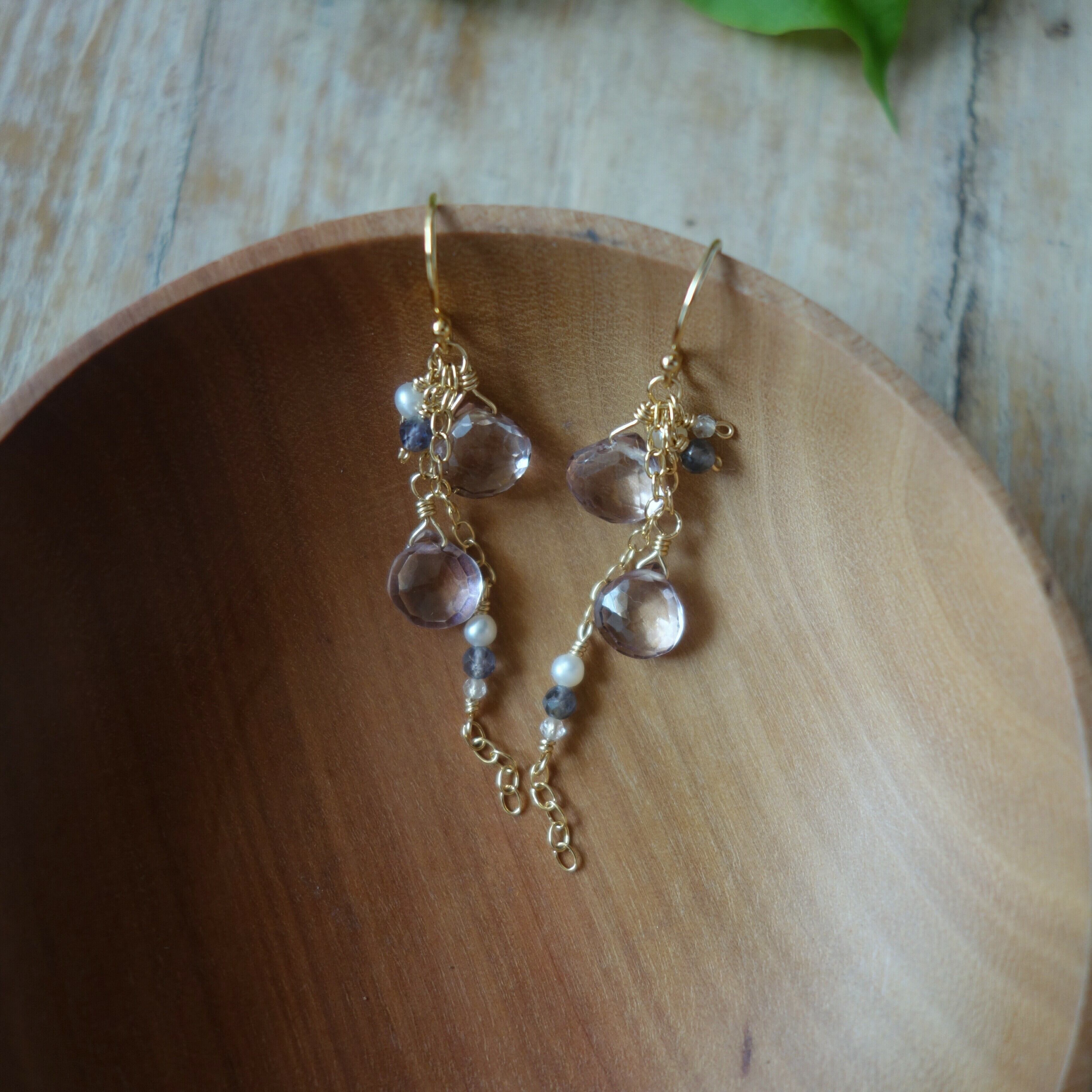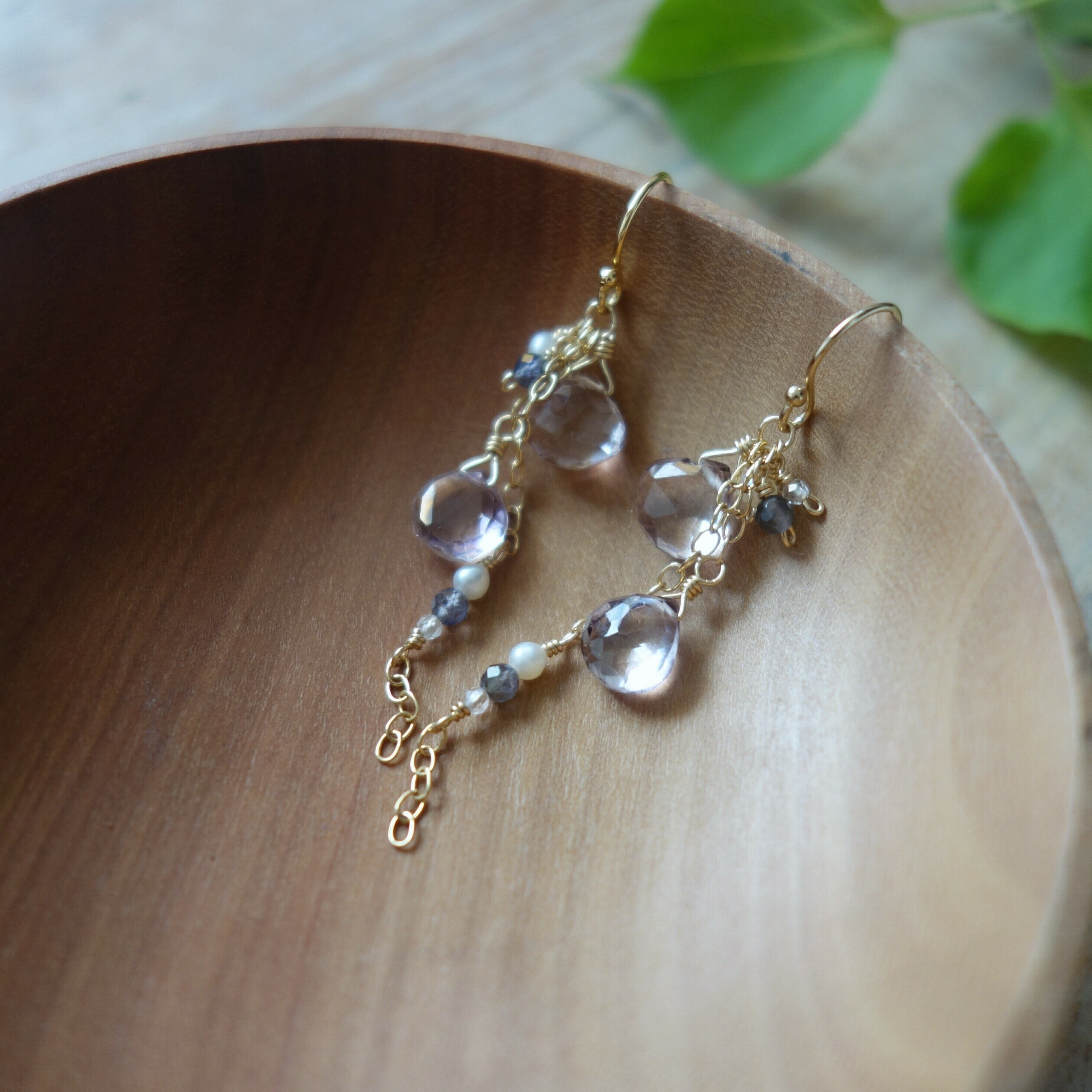 淡い色合いのピンクアメジストに、アイオライト、淡水パール、ホワイトトパーズをあわせた春らしい色合いのピアスです。