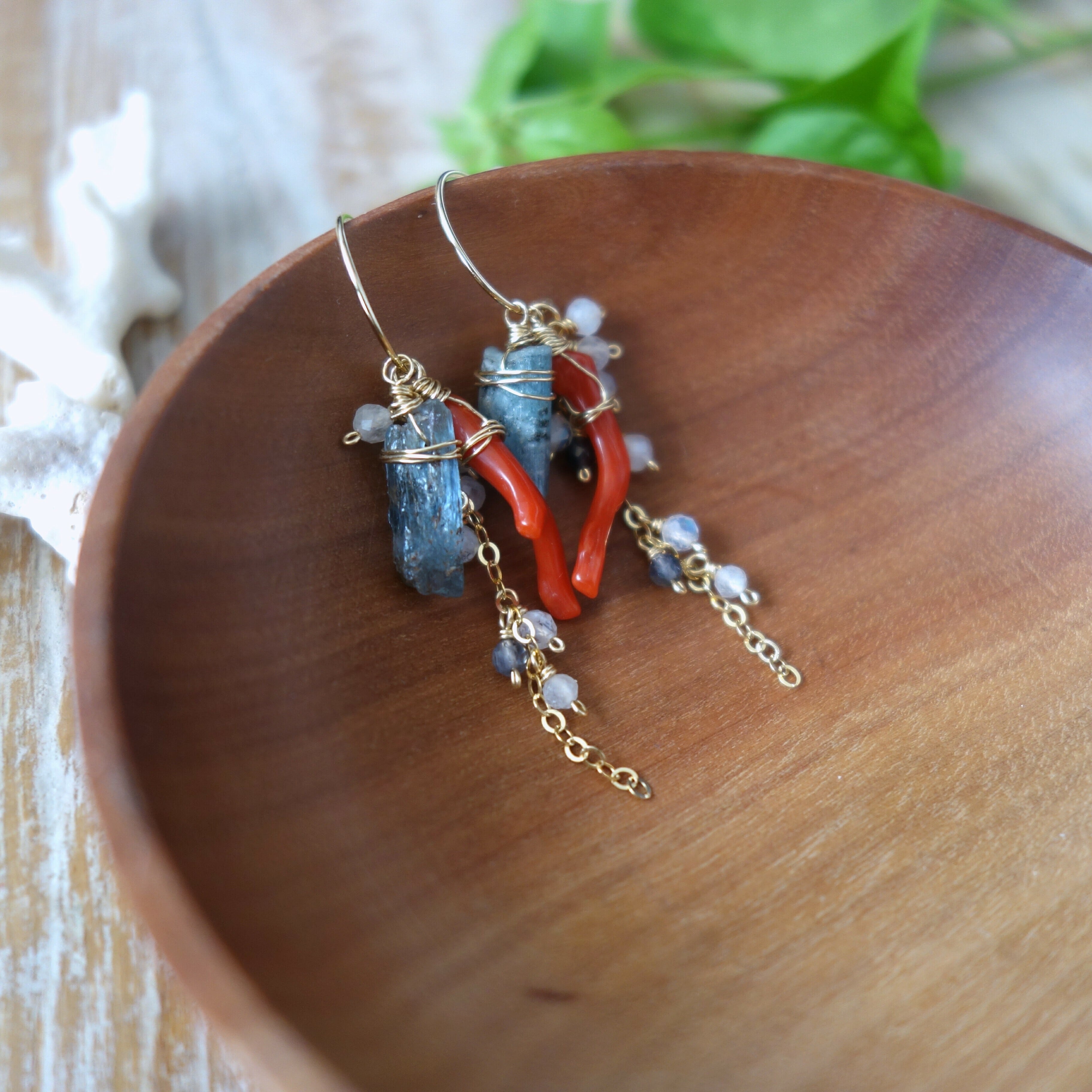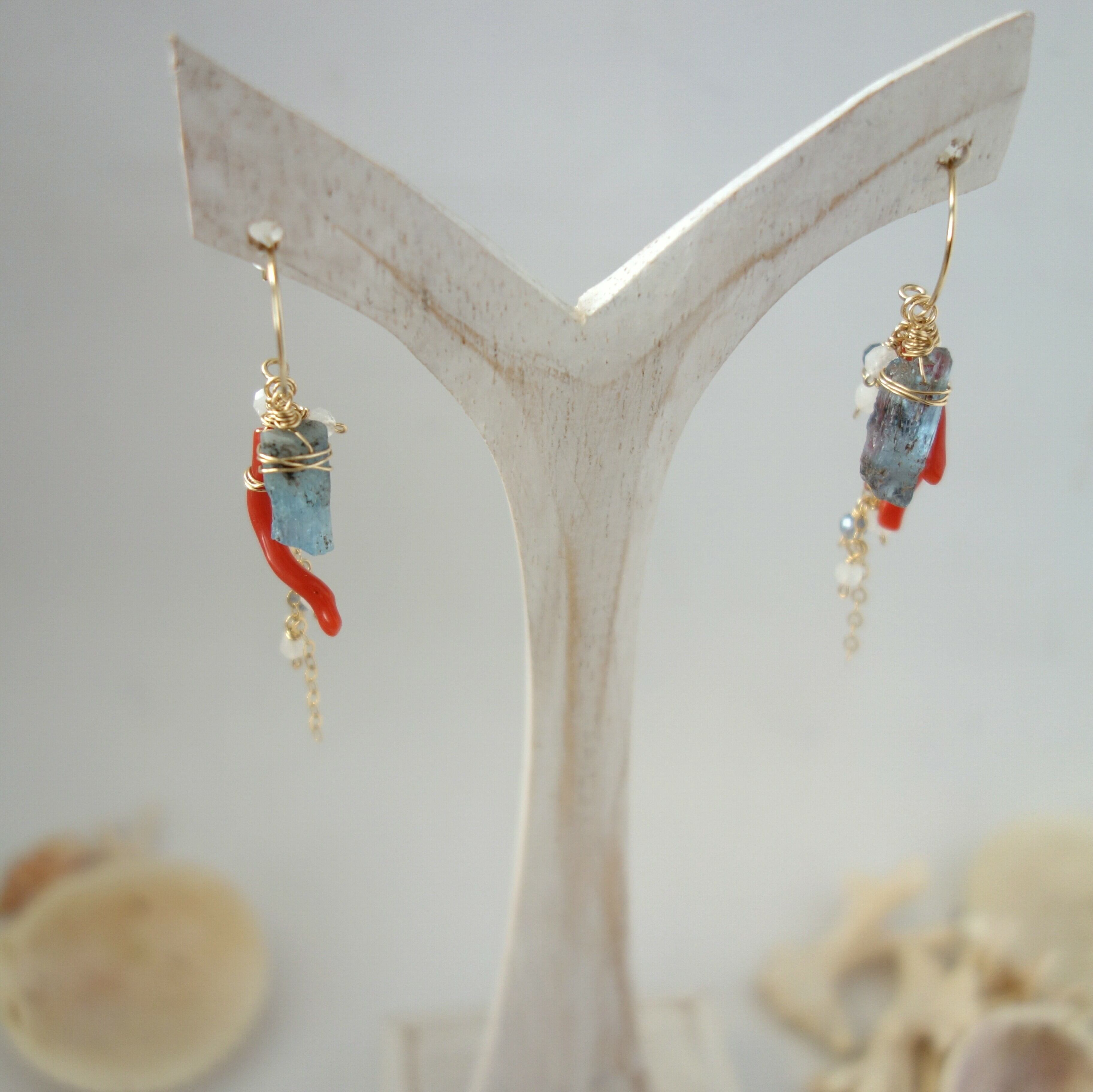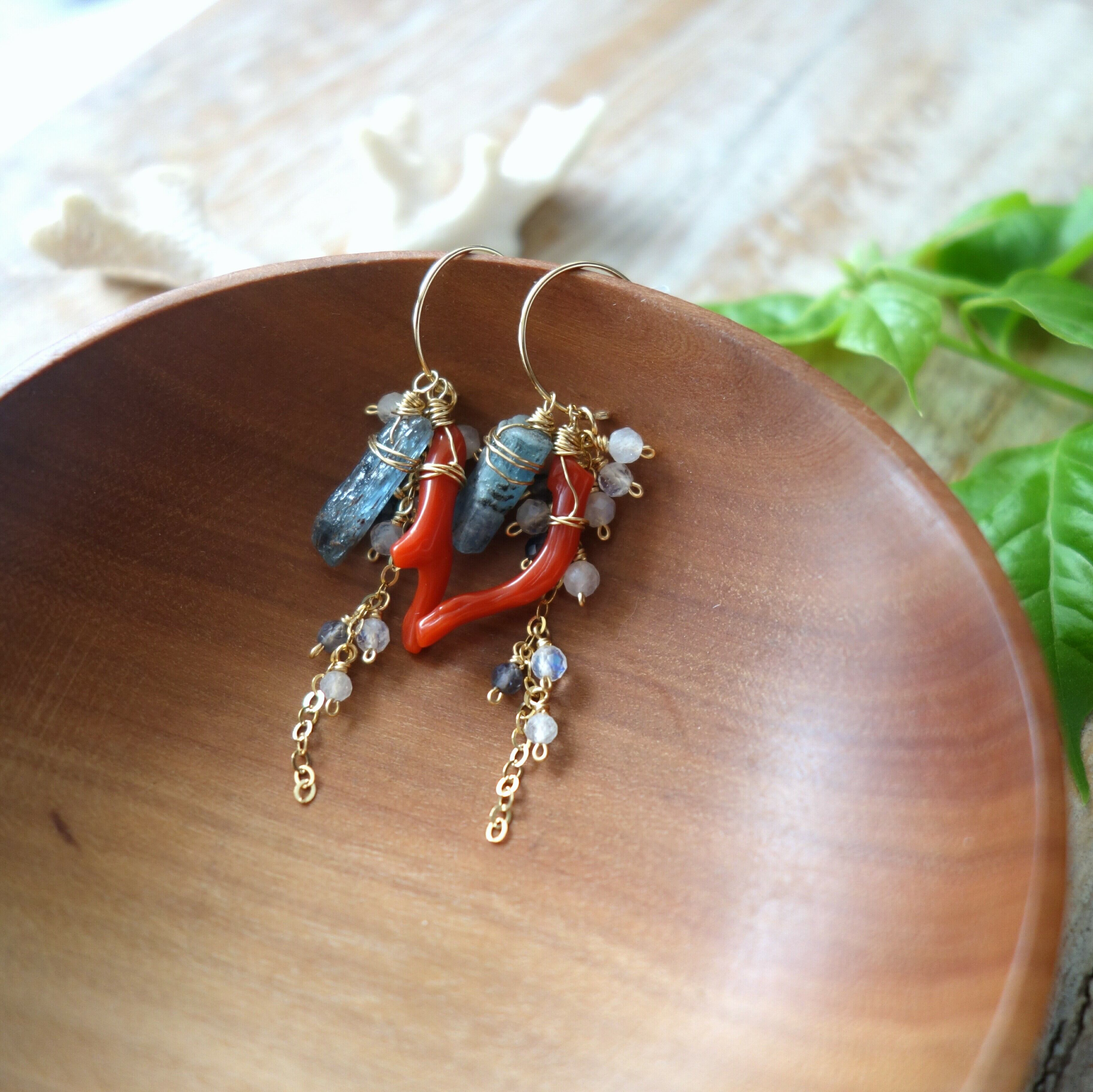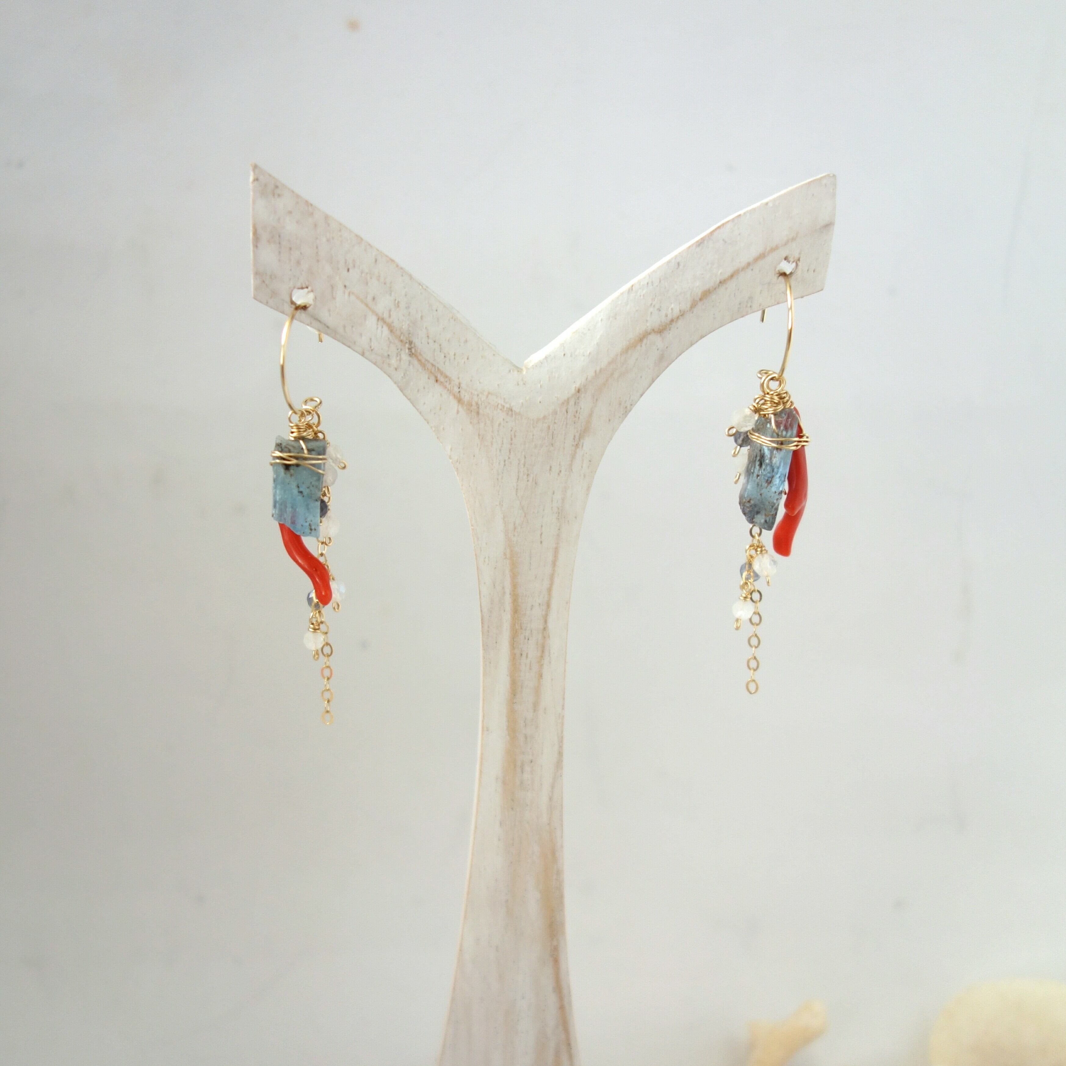 原石アクアマリンと天然色レッドコーラルの着せ替えピアス【14kgf/天然石】