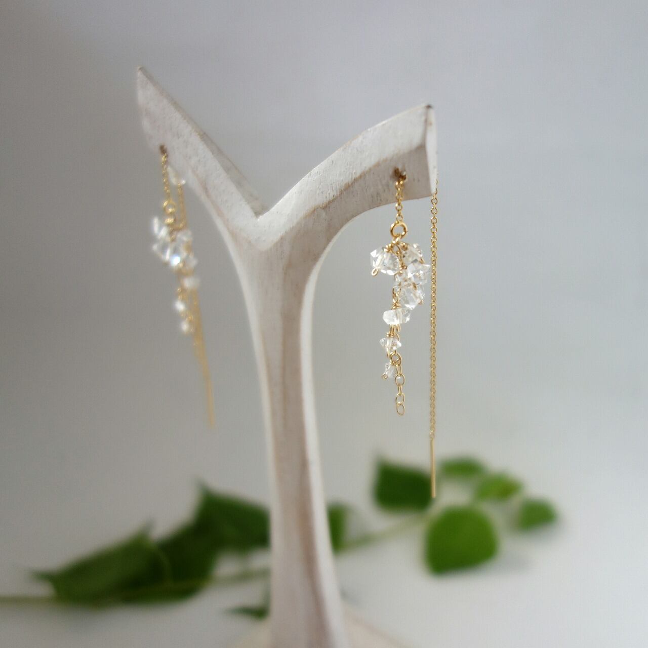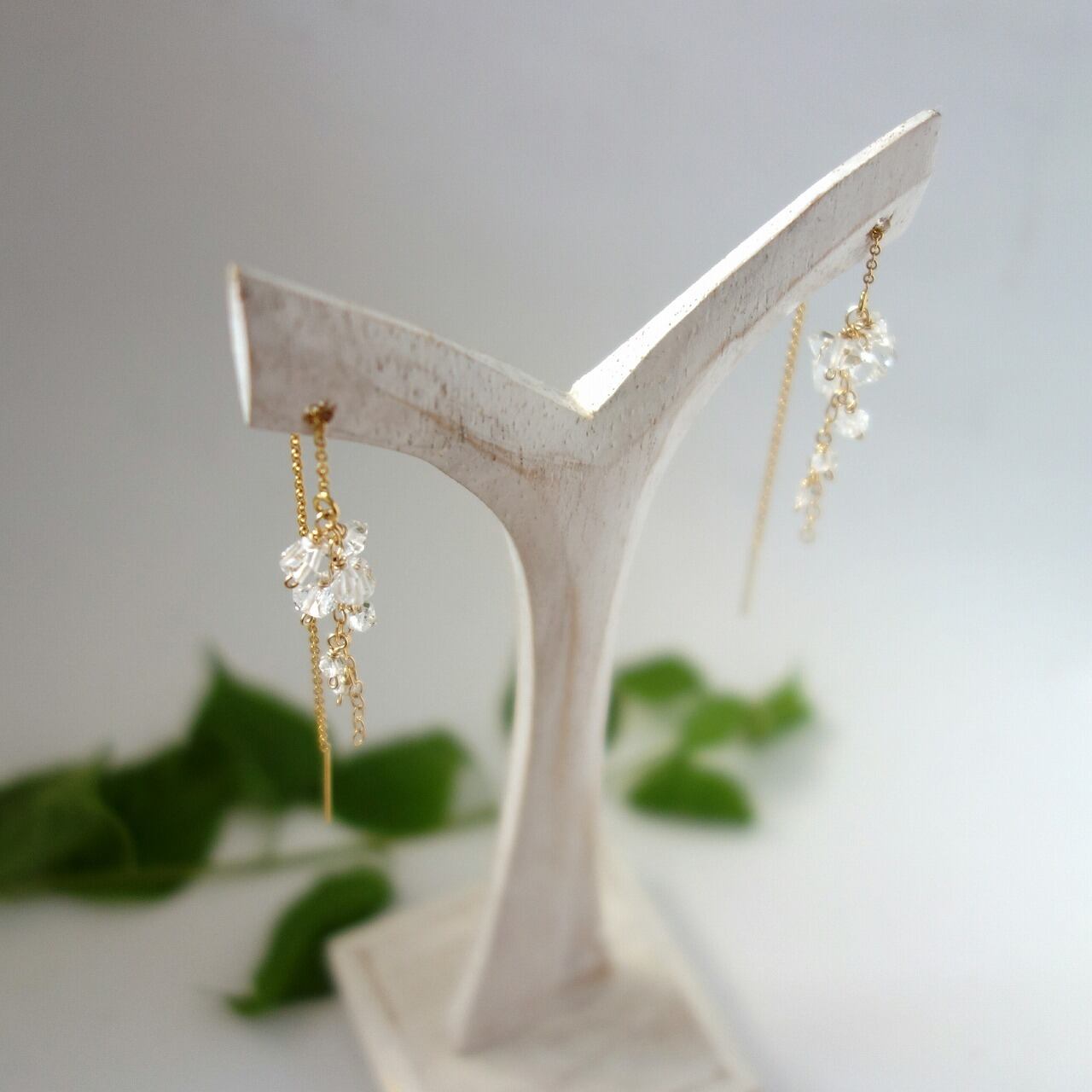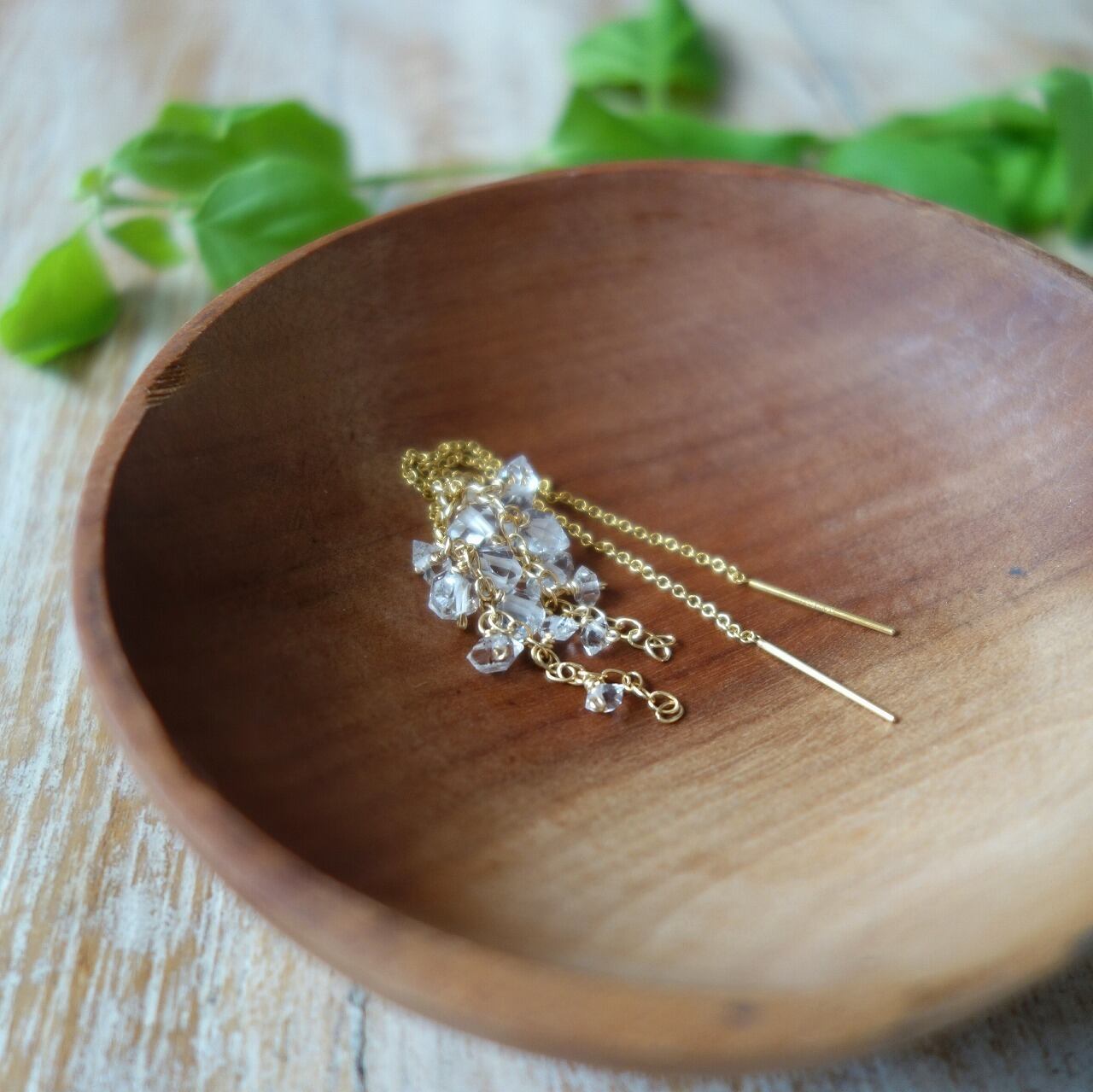 清涼感あふれるハーキマーダイヤモンドとアメリカンピアスのチェーンが動くたびに軽やかに揺れ、耳もとのよいアクセントとなってくれます。
