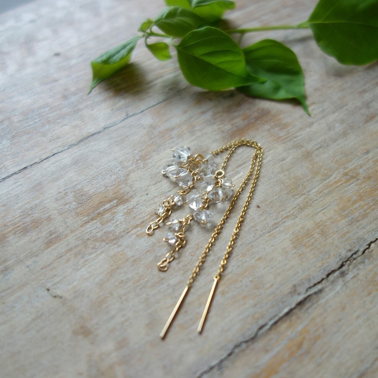 透明度の高いNY産のハーキマーダイヤモンド(水晶)をランダムに繋いだアメリカンピアスです。