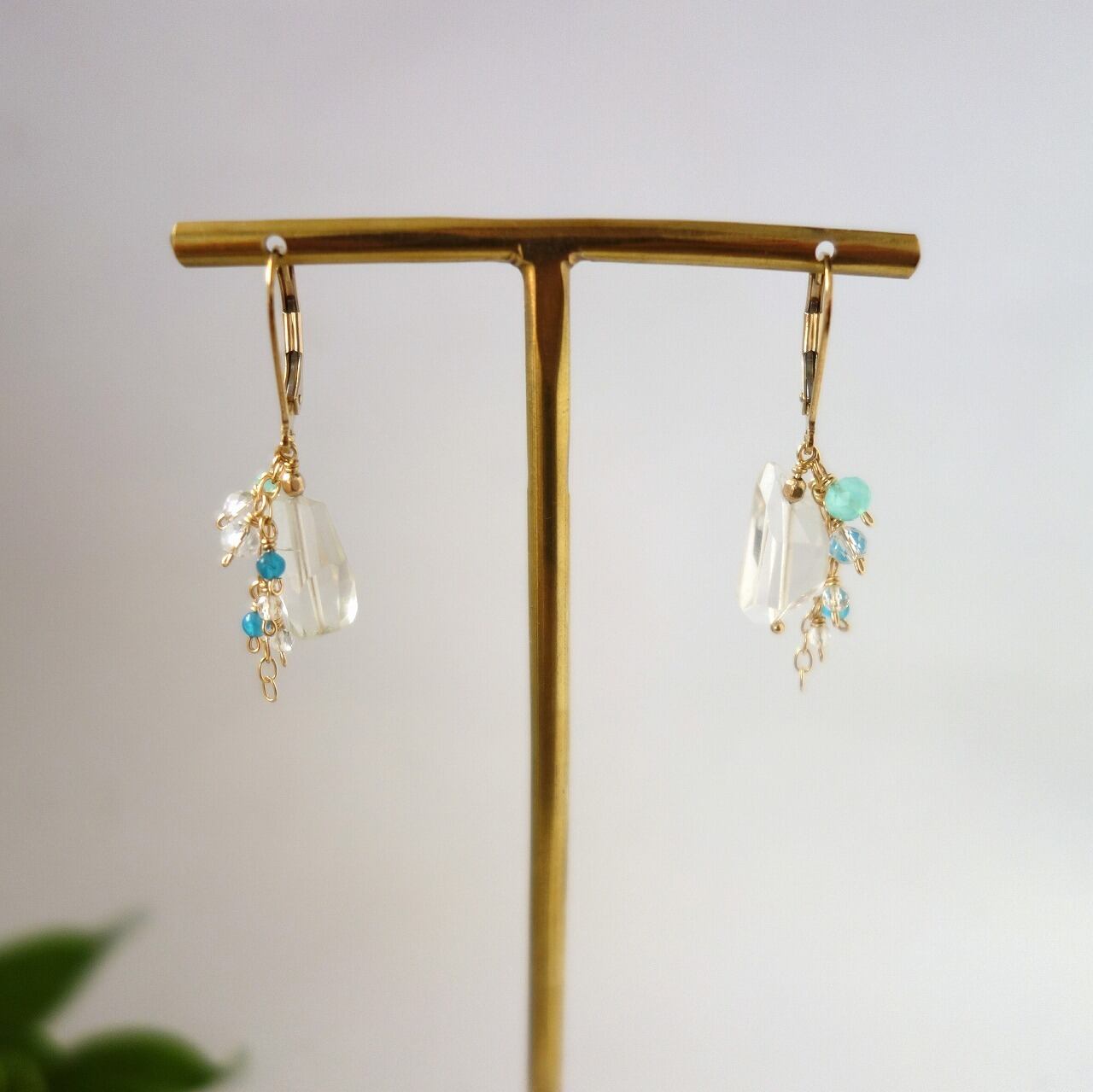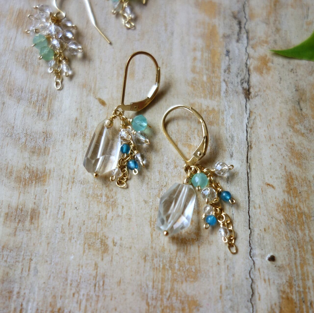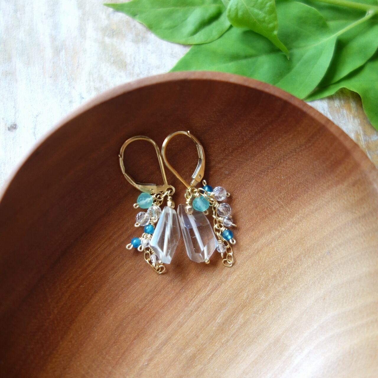 大粒のクリスタルクォーツ(天然水晶)に、爽やかな色合いのブルーオパールやアパタイトを合わせたピアスです。