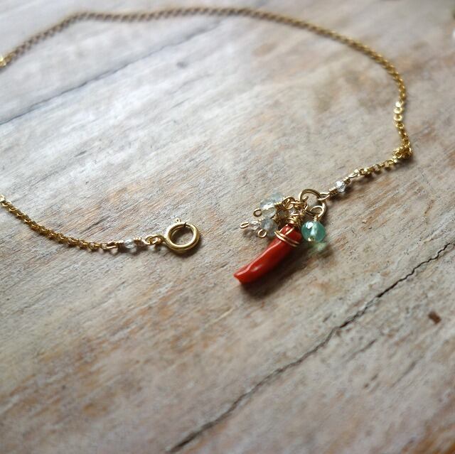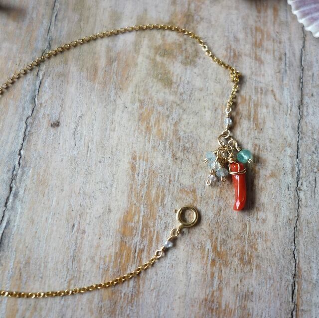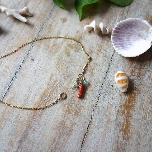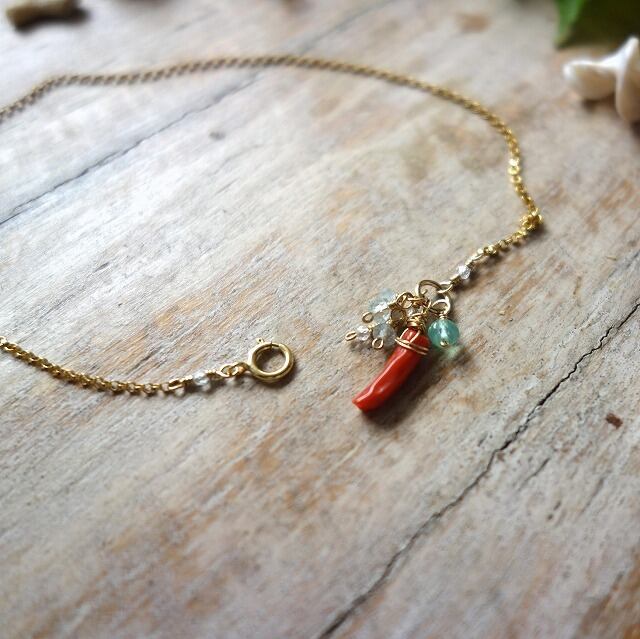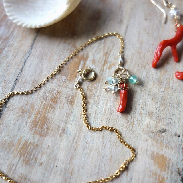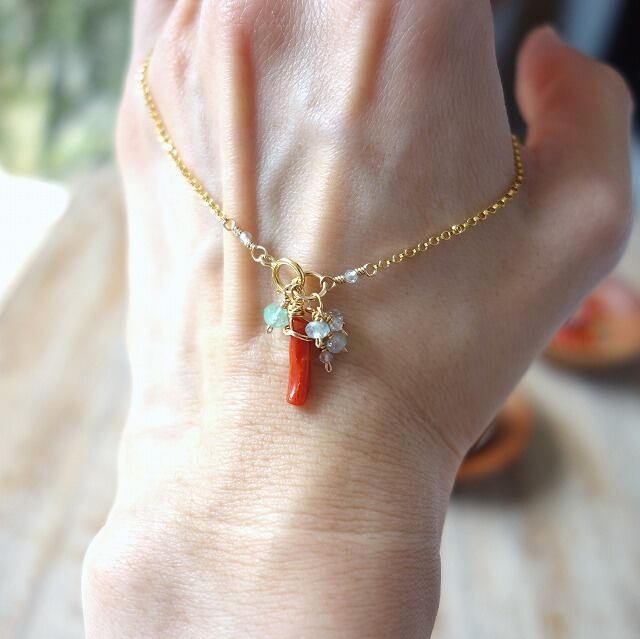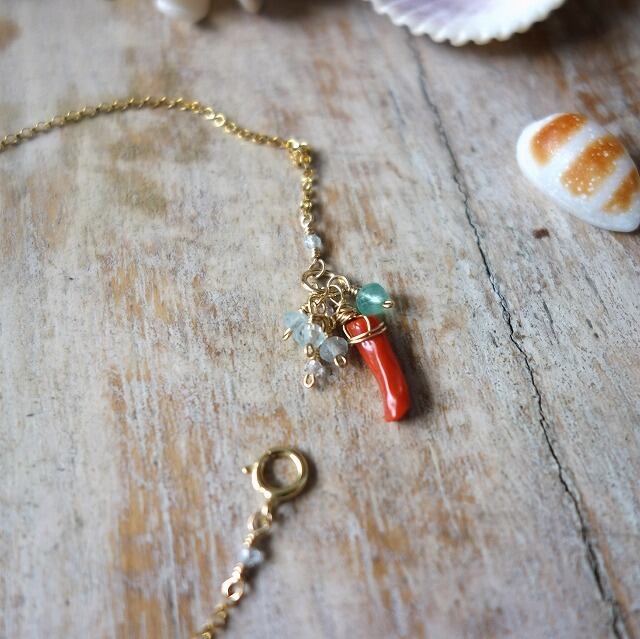 鮮やかな天然珊瑚の赤に、アクアマリンやブルーオパールなどの涼しげな天然石を合わせて爽やかさのあるアンクレットとなっています。